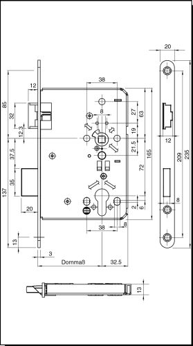 Nach DIN 18251, Klasse 3. Verzinkter, allseitig geschlossener Schlosskasten mit montagefreundlicher Zuführung der Zylinder-Befestigungsschraube. Falle und Riegel aus Zinkdruckguss, verzinkt. Stulp Nickel silber lackiert.Nuss aus Zinkdruckguss mit 8 mm Vierkant, Entfernung 72 mm, mit Wechselfunktion (PZW). WC Entfernung 78 mm.