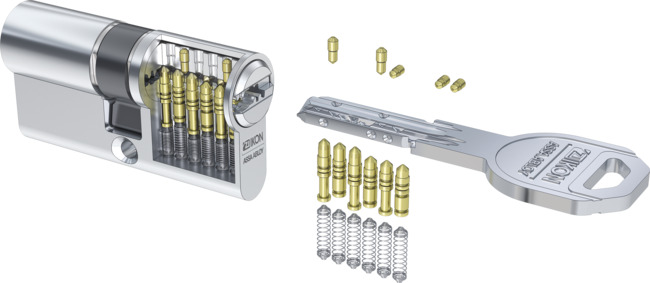 Dabei kommen 6 aktiv gefederte Zuhaltungen in verschiedenen Ausführungen und Stufen zum Einsatz. 5 zusätzliche seitliche Abfragestifte auf insgesamt 11 unterschiedlichen Positionen sorgen für mehr Sicherheit gegenüber gängigen Manipulationsmethoden.
